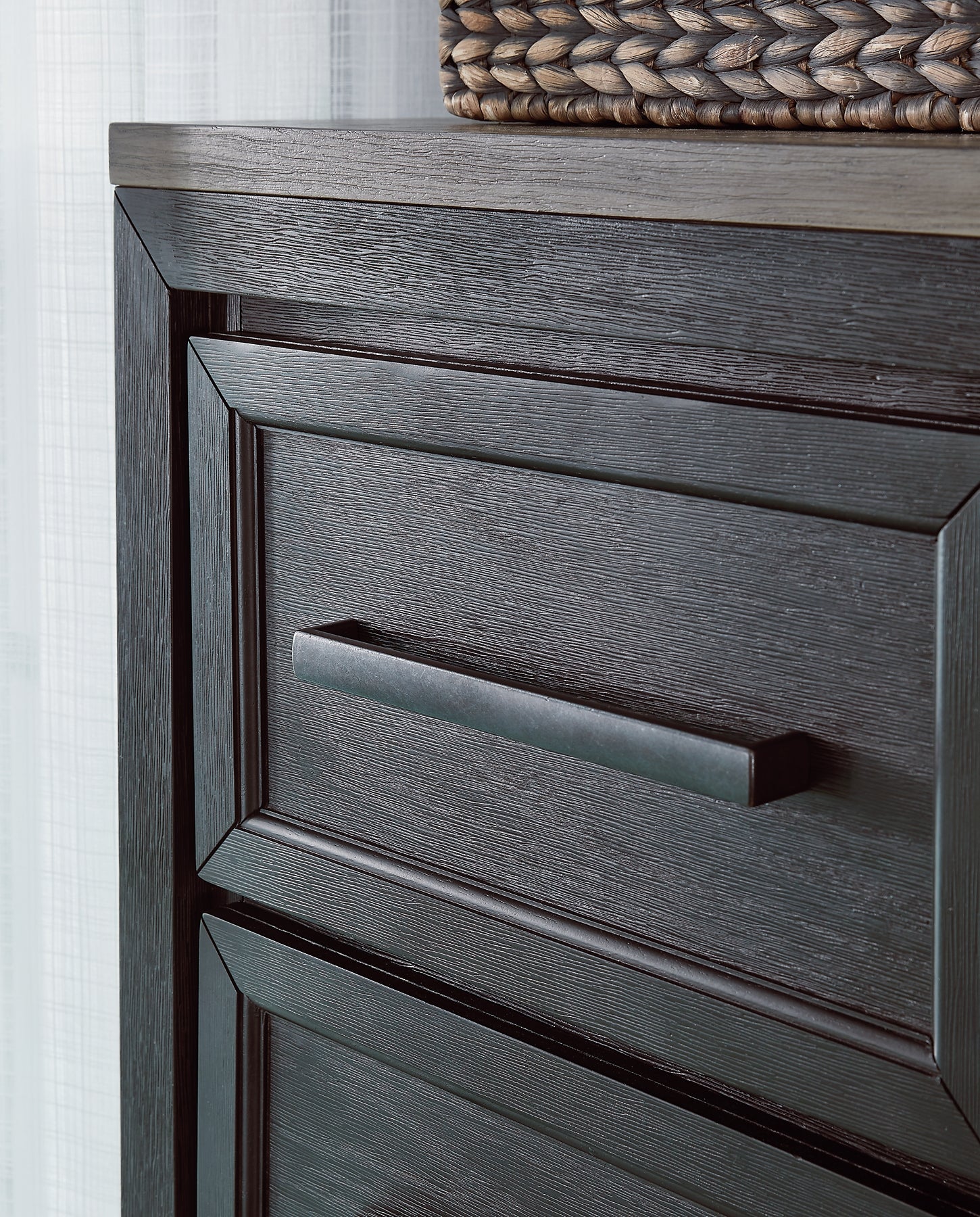 This door chest is casual contemporary style simply done right. Its two-tone color scheme features a rich brushed black main color accented with a beautiful dusty grayish brown wood tone. And there's plenty of storage to accommodate your wardrobe needs with ease. The dresser has 5 soft-close drawers, and behind the door you'll find pull-out trays for shoes or other accessories, along with shelving for bulky items.
