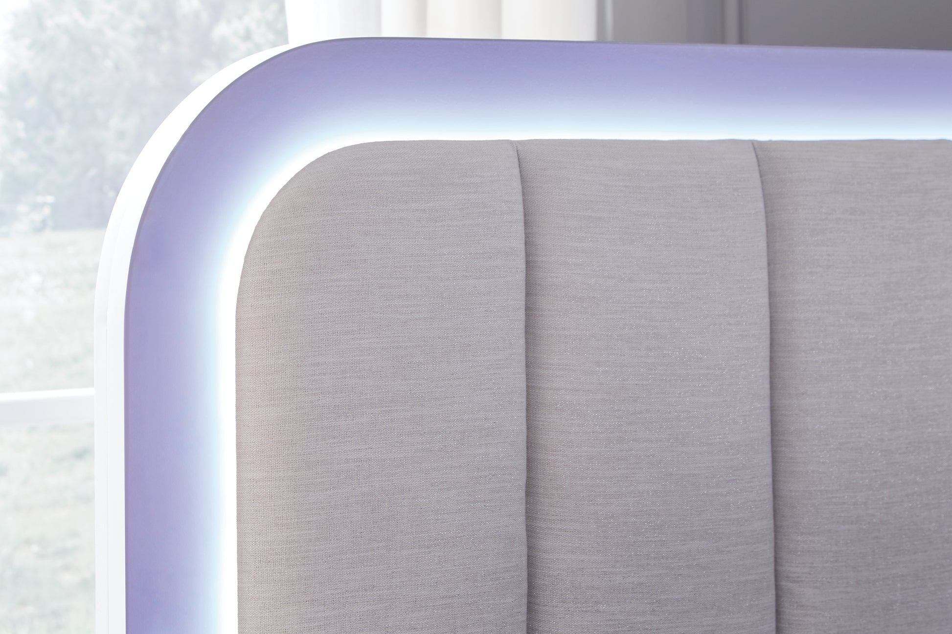 Details Includes queen upholstered panel headboard, footboard, rails and roll slats, Made with hardwood solids and MDF substrates, Side rails feature laminated solid hardwood slat support rails (or LVL) with glued and screwed blocking for added strength , White paint finish, Polyester upholstery, Built-in LED lighting; 3-way dimmer switch, Power cord included; UL Listed, Bed does not require additional foundation/box spring; accommodates most zero clearance adjustable bases , Mattress available, sold separately, Assembly required