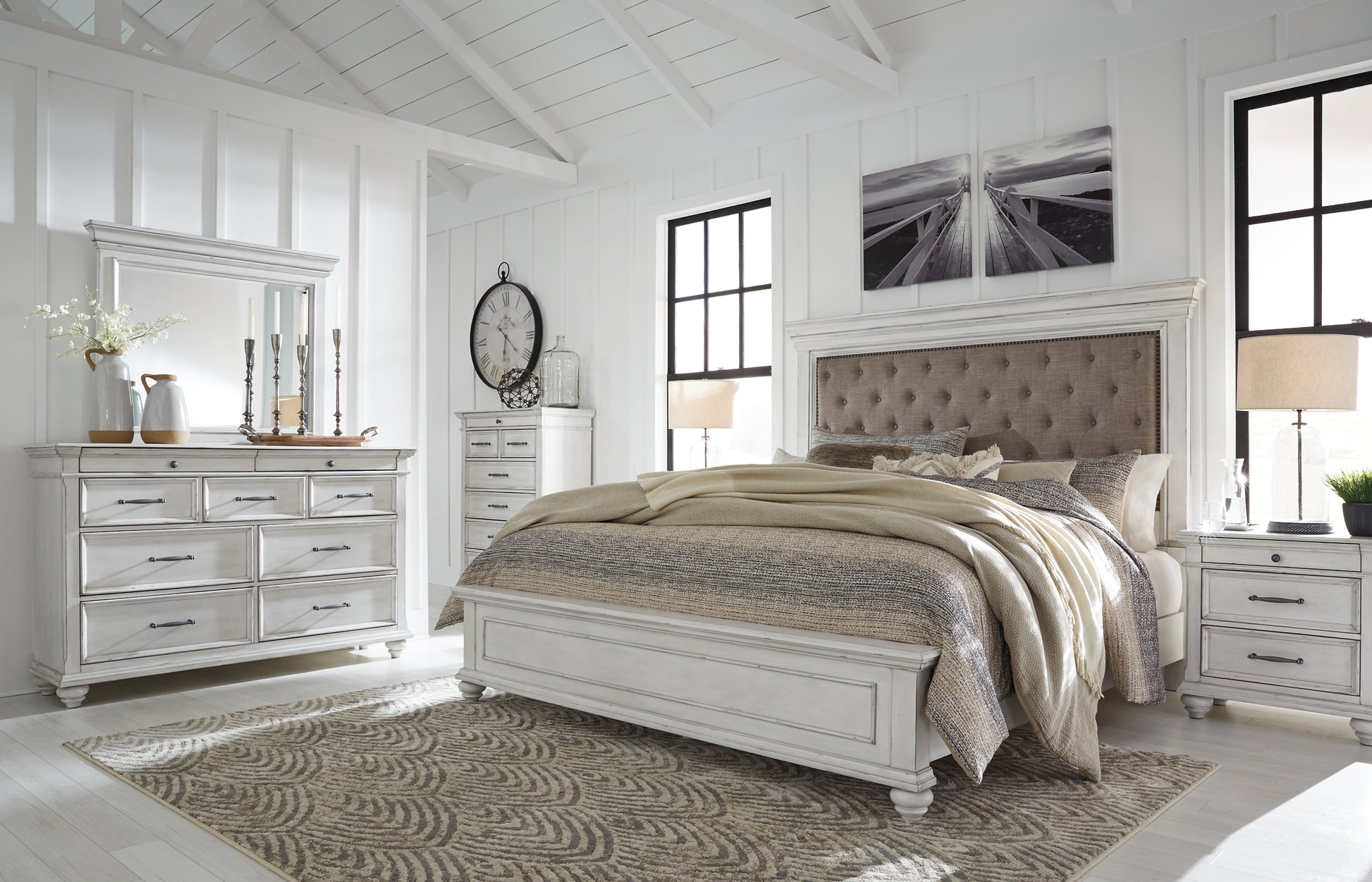 Give your retreat vintage charm with this queen upholstered panel bed. In a beautifully distressed whitewash finish, you'll love the headboard's grand style featuring an inset button tufted upholstery cushion. Generously scaled moulding from top to bottom, along with bun feet and nailhead trim give this bed character—evoking the feel of a quaint cottage escape.